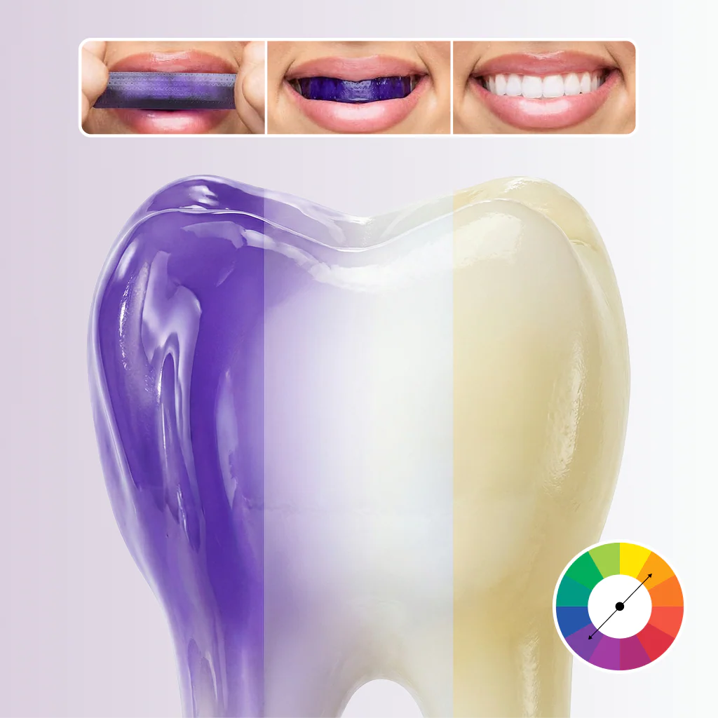 - Tecnologia Viola Anti-Giallo — Funziona come un correttore, ma per il sorriso. Riduce istantaneamente i riflessi gialli per denti visibilmente più bianchi fin dal primo utilizzo.