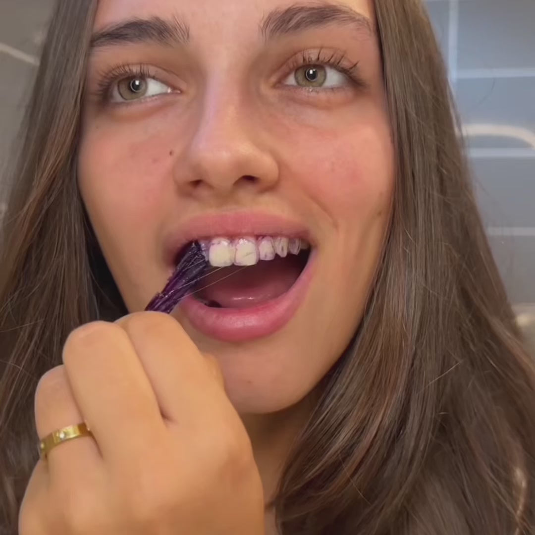 1. Applicare la striscia sbiancante viola sui denti puliti e asciutti e lisciarla bene.